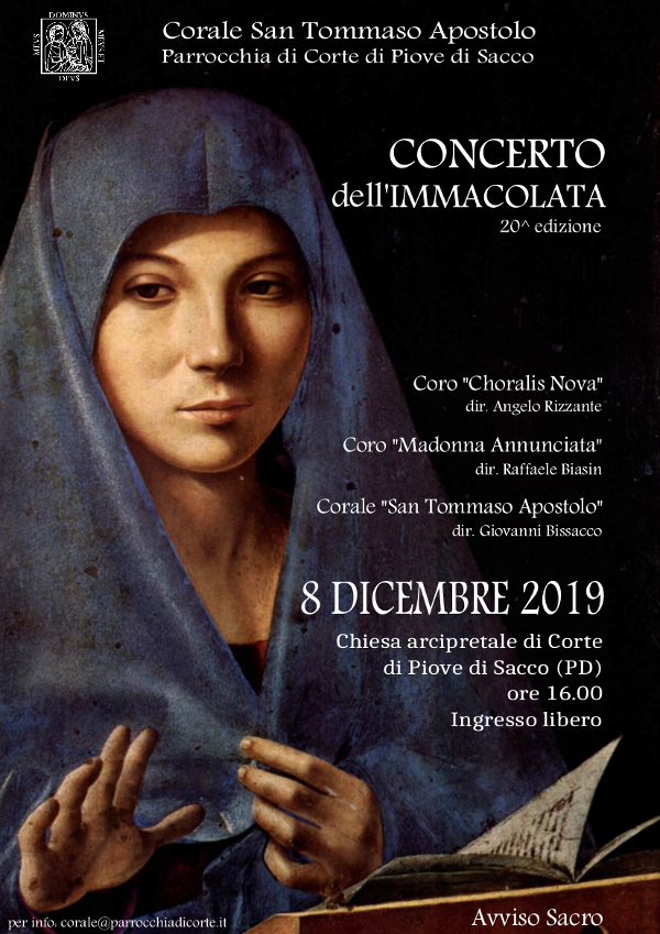 La Corale "San Tommaso Apostolo" e la Parrocchia di Corte sono liete di invitarvi alla 20.a edizione del "Concerto dell'Immacolata" che si terrà domenica 8 dicembre 2019 alle ore 16.00 presso la Chiesa arcipretale di Corte. Oltre alla nostra Corale parrocchiale vi sarà la partecipazione della "Choralis Nova" di Legnaro diretta dal maestro Angelo Rizzante, dal Coro "Madonna Annunciata" di Arzergrande diretto dal maestro Raffaele Biasin.
